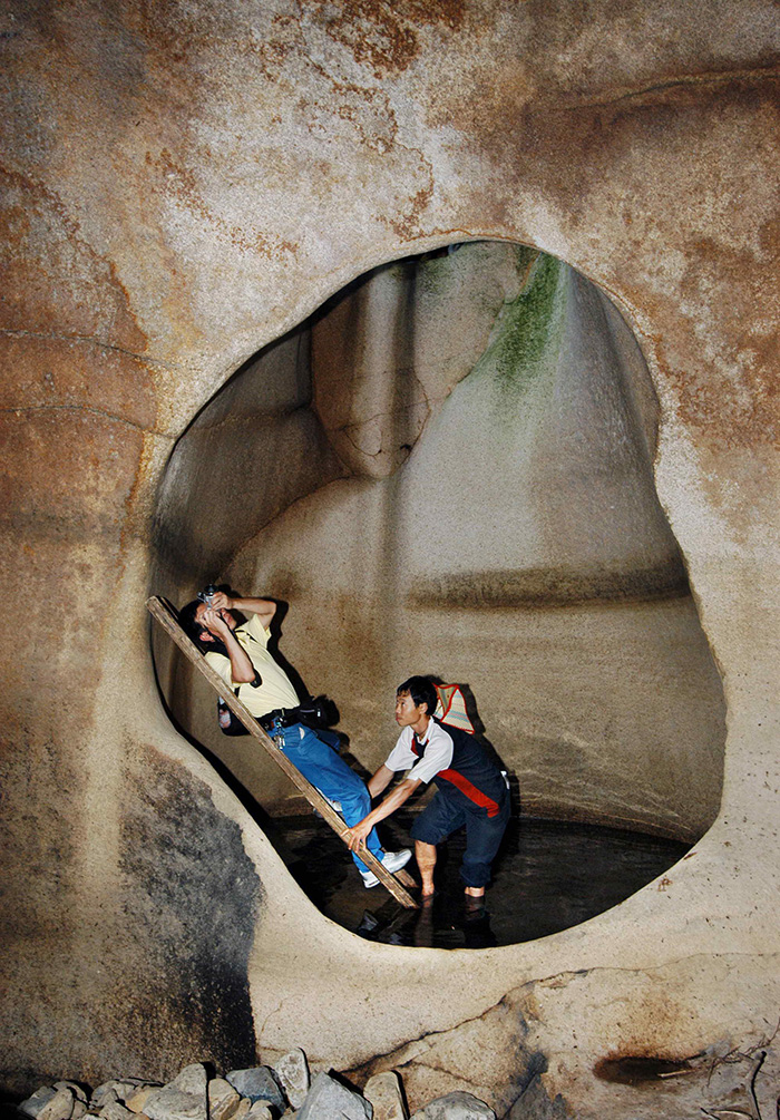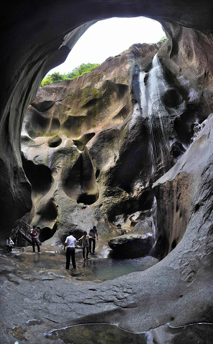 飞天井为特大型的穿壁壶穴,直径约30 m,深约50 m,规模宏大。穴壁凹凸有致,反映出跌水冲蚀与涡流磨蚀同时进行的迹象。